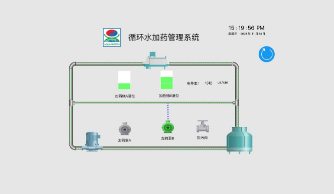 利用電導(dǎo)率、pH等傳感器在線對循環(huán)水水質(zhì)進行實時分析,通過自控系統(tǒng)及智慧云管理平臺實現(xiàn)對循環(huán)水的實時檢測,遠程監(jiān)測,自動排污,自動加藥,濃度控制等、從而實現(xiàn)循環(huán)水高效管理。